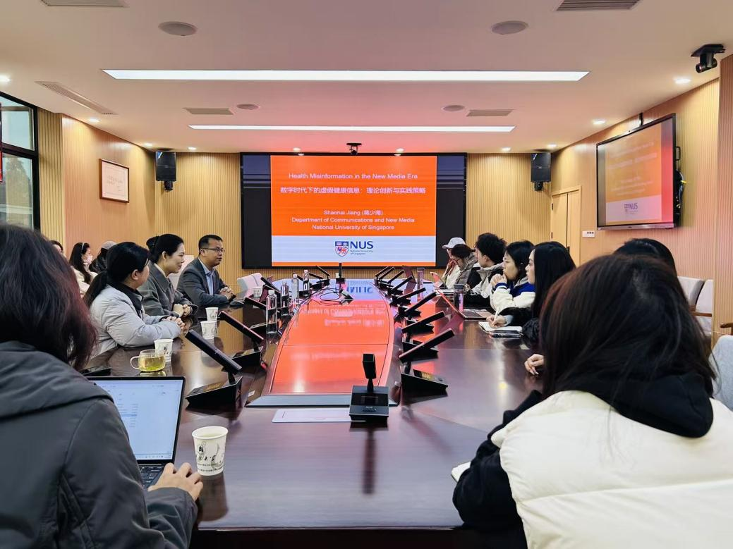 12月4日,新加坡国立大学传播与新媒体系蒋少海教授受邀到访我院,为我院师生带来一场内容丰富的学术讲座。蒋少海深耕医患沟通、电子健康、健康传播等领域,曾获全美传播学会健康传播分会2024年度青年学者奖等多项荣誉,连续入选斯坦福大学全球前2%顶尖科学家榜单。本次讲座由学院院长张帆主持,学院部分师生参加。