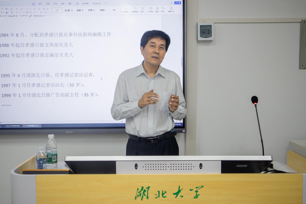 2025年9月18日,全国优秀新闻工作者、前湖北日报传媒集团编委、编辑出版中心主任胡祥修应邀走进我院融合新闻学课堂,为2023级新闻学和视听传播学专业带来题为“新时期,需要什么样的新闻传播人才”的主题讲座。