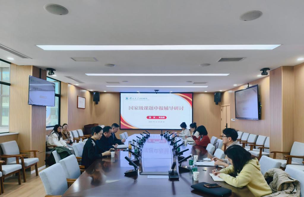 为进一步做好2026年度国家级课题的申报工作,提高国家级课题申报数量和质量,我院于2025年11月26日上午在逸夫楼A6012会议室举行了国家级课题申报辅导研讨会。本次会议特别邀请武汉大学刘金波编审来院指导,我院院长张帆以及学院部分教师参加会议,会议由副院长黎明主持。
