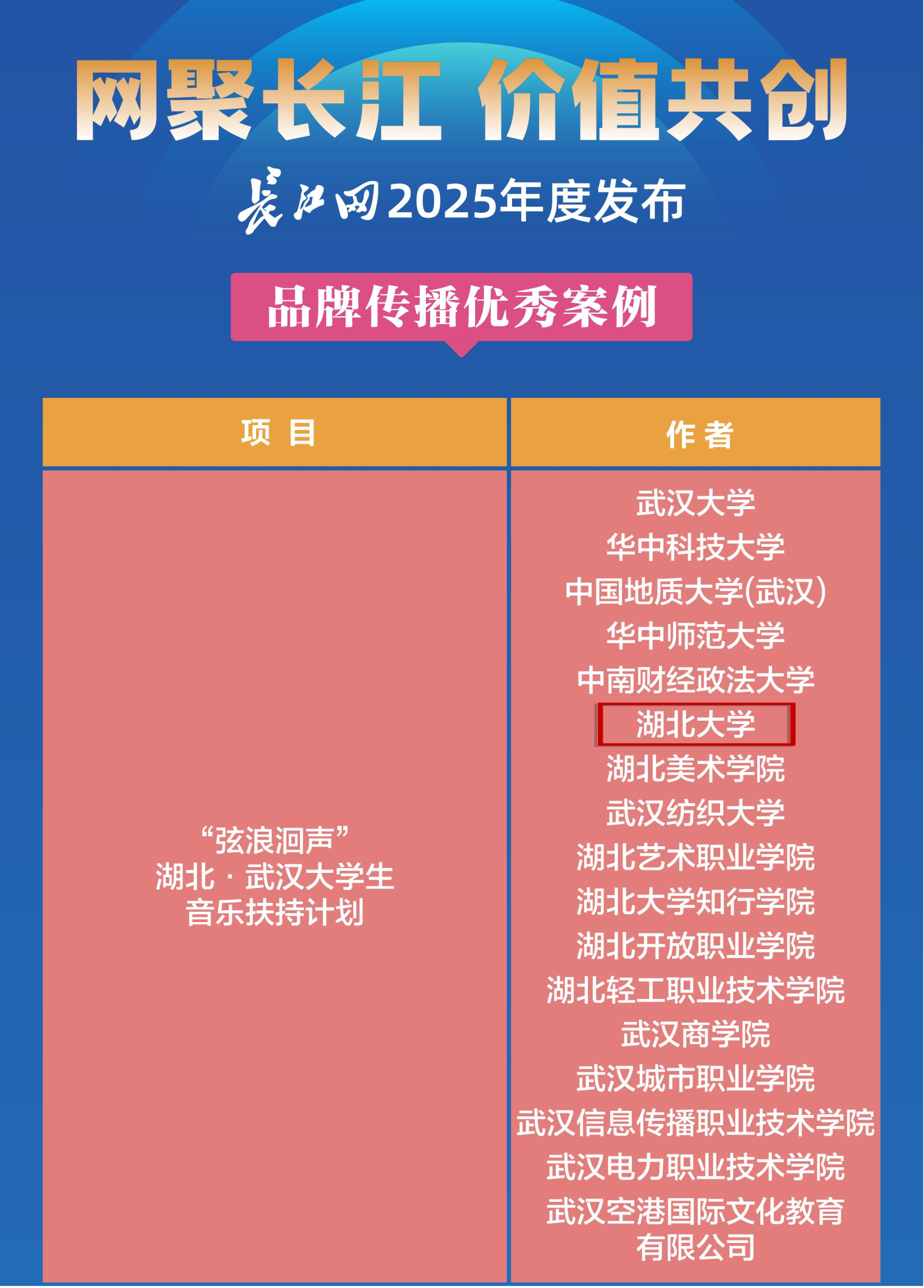 1月31日,“网聚长江 价值共创——长江网2025年度发布”活动举行。活动现场发布了《2025年度城市传播全国影响力案例》《2025年度政务传播创新案例》和《2025年度品牌传播创新案例》,83件优秀案例脱颖而出。其中,我校与长江网、空港文教等单位联合承办的“弦浪洄声”湖北·武汉大学生音乐扶持计划,成功入选“2025年度品牌传播优秀案例”。