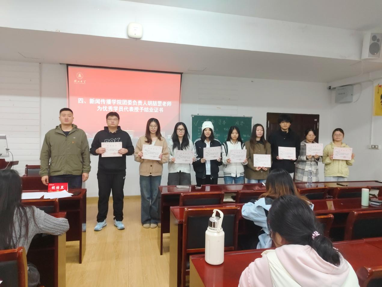结业仪式上,我院团委负责人胡喆罡对团校工作进行总结,肯定了学员们的学习成果,并为优秀学员代表颁发结业证书,为本次团校学习画上圆满句号。我院学员代表2025级博士生孙涵阅在交流分享中说到:“从领袖诗词学习到AI知识科普,从线上理论学习到线下实践调研,本次团校课程让我不仅提升了思想高度,更掌握了实用技能。未来自己将以更积极的姿态向团组织靠拢,践行青年责任。”